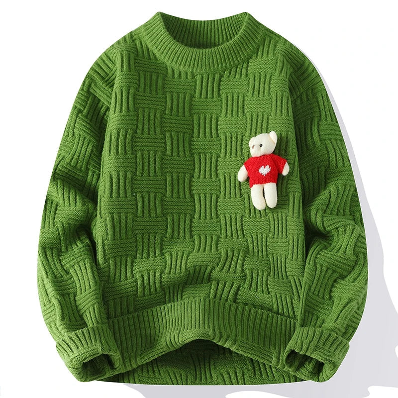 This textured knit sweater brings a fresh twist with a stitched-on teddy bear that adds just the right amount of edge. Made with unmatched softness and a thick yet lightweight design, it keeps you warm without the bulk. It’s laid-back, cool, and anything but basic.