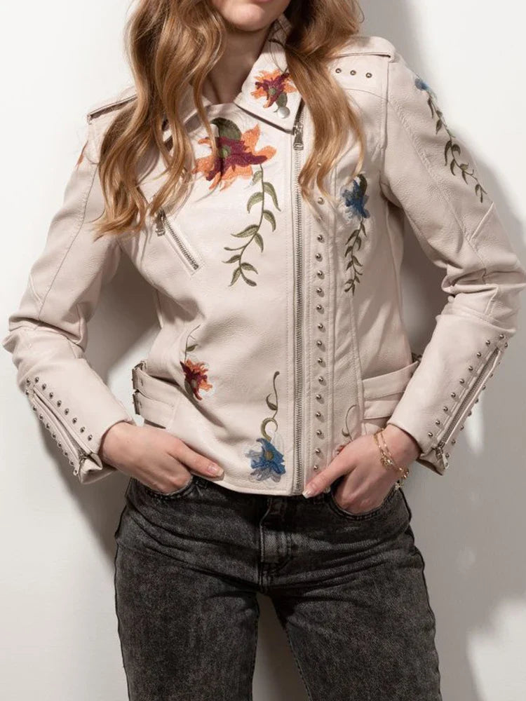 Cut from smooth faux leather that shapes the biker profile with a clean, confident line. Floral embroidery introduces soft contrast, and the subtle stud details keep the look grounded and defined.